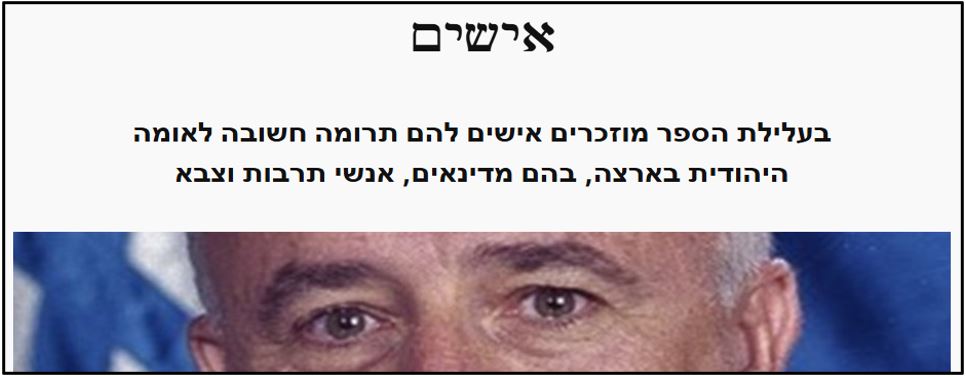 הספר גם מזכיר אישים להם תרומה ייחודית לאומה הישראלית-יהודית לאורך הדורות: