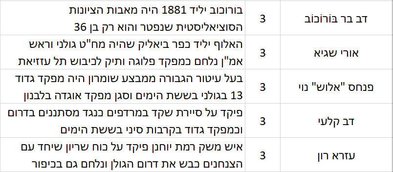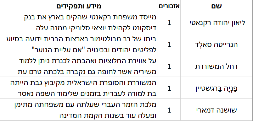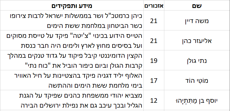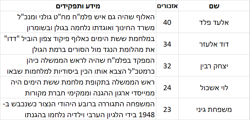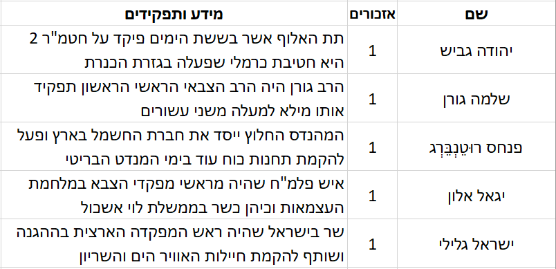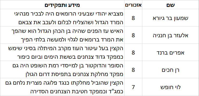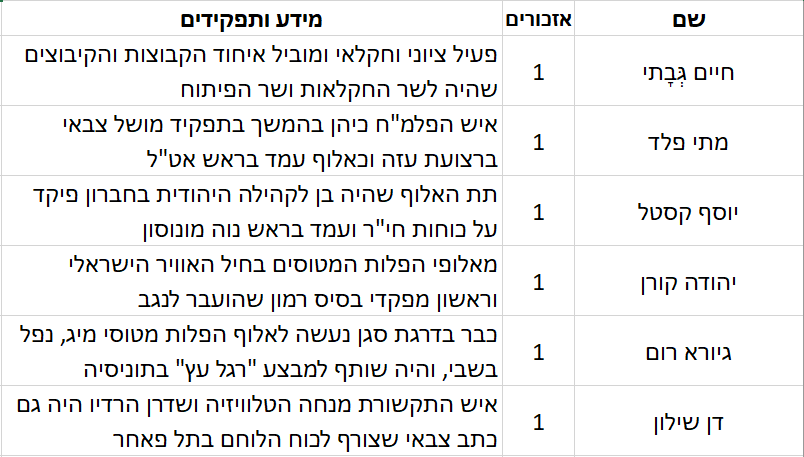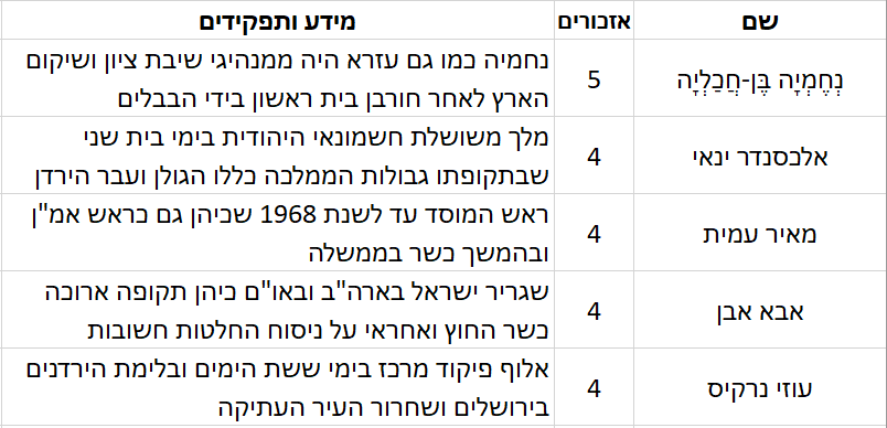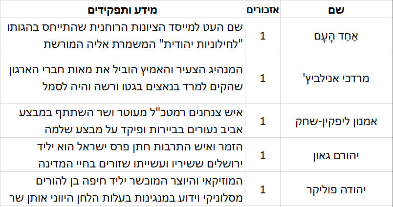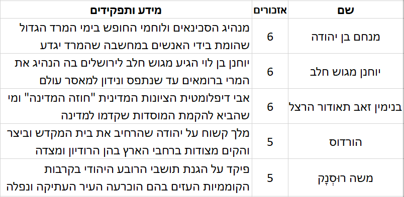 בעלילת הספר מוזכרים אישים להם תרומה חשובה לאומה היהודית בארצה, בהם מדינאים, אנשי תרבות וצבא